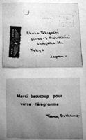 これに対して、ティニー夫人から10月11日付けで、以下のような、ゴム版スタンプの挨拶状が届いた(図13-3)。この挨拶状について、同じ「ローズ・セラヴィ’58~’68」で瀧口は、「形式ばった印刷を避けてゴム版で電報の礼のみを述べてあるのに深い心くばりを感じる」としている。