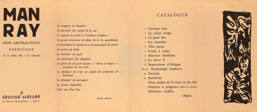 説明文にあるギャラリー『封印された星』は、第二次世界大戦が終わってパリに戻ったアンドレ・ブルトンが関わった画廊で、中断を挟みながら1952年から56年までの間に、エルンスト、マン・レイ、ラムの他に、ブルトンのプロモートによって、シモン・アンタイ、トワイヤン、スワンベリ、モリニエなどの若い作家の展覧会も多数開いている。実は、ドルオーでオークションが開かれた前の年に、『マン・レイ 非・抽象』と黄色い紙に刷られた案内状を入手していたので、「室内の毛皮漁師」「シャッターの王子」「不動の遊戯者」と様々に友人マン・レイを讃えるブルトンの詩を読みながら、出品リストのタイトルから、展示構成を想像していた訳である。──詳細はいずれ報告するつもりであるが、狭い会場だったと聞く。