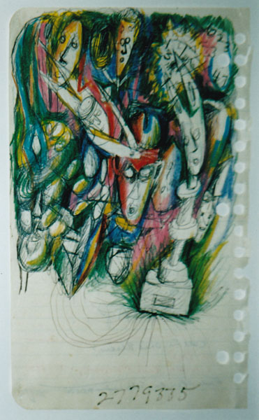 500枚ぐらいあっただろうか……。すべて、よくある螺旋状の金具でとじられたノートの紙〔横線の入った〕に色エンピツやクレヨン、ペンで描かれた作品だった。どれも小品である。
