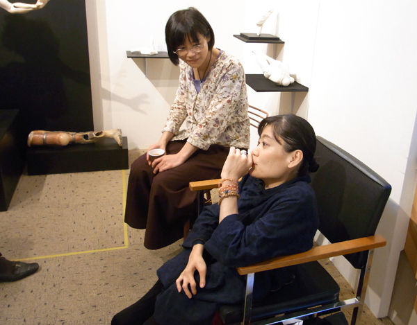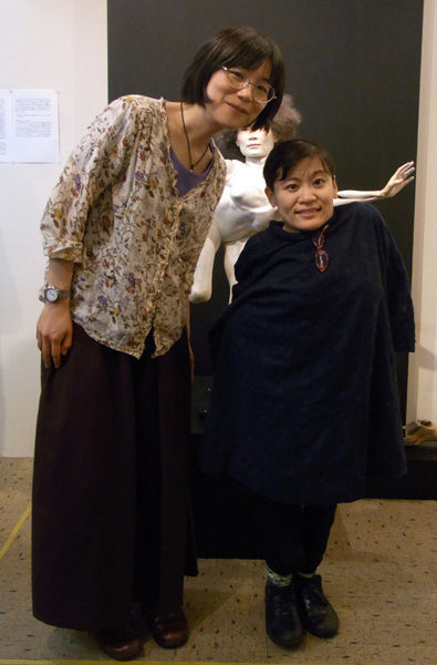 人形作家の井桁裕子さん(左)と舞踏家の森田かずよさん(右)井桁さんは以前より《桝形山の鬼 舞踏家・吉本大輔氏肖像》、《Kei doll 舞踏家・石川慶氏肖像》や《加速する私たち 舞踏家・高橋理通子氏肖像》等、舞踏家の方の肖像作品を作られていますが、普段は井桁さんからモデルとなる人物へ依頼するところ、今回は2012年4月、ART KYOTO 2012で知り合った森田さんの方から自分の作品を作って欲しいと依頼があったそうです。とはいえ森田さんが意図していたのは自分の体形を客観視できる卓上サイズのフィギュアで、最終的にこのようなサイズの作品になるとは思ってもみなかったようですが。