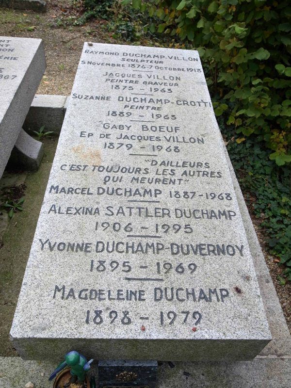 デュシャンの没後、遺言が残されており、死亡通知、葬儀、記念行事などは行わないように記されていた。ジャック・ヴィヨン、レイモン・デュシャン=ヴィヨンの兄2人と、妹のシュザンヌ・クロッティが眠る墓に、遺骨が埋葬された。「さりながら 死ぬのはいつも 他人なり」(瀧口訳)という碑銘が刻まれた(図14-4)。