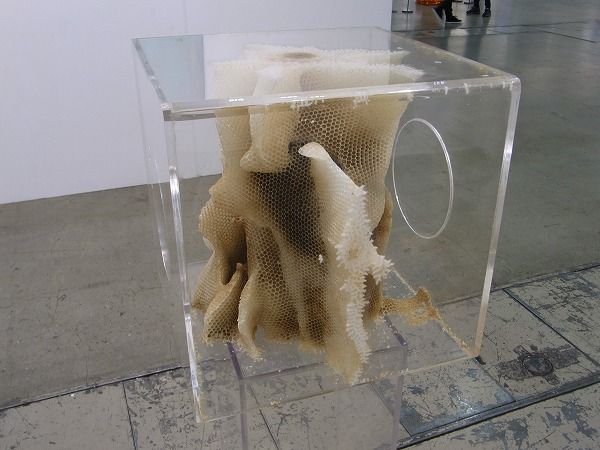 蜂の生態に通じた作家が女王蜂のポジショニングとアクリルのキューブを回転させることによって完成する、なんともユニークなコラボレーション(?)作品。