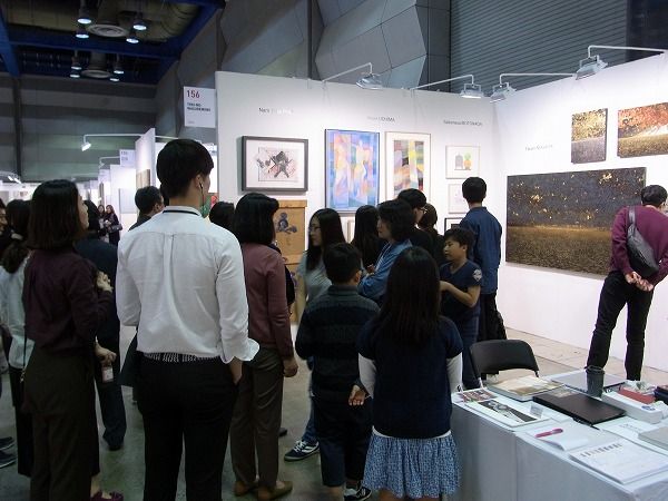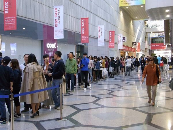 今回のKIAFでは事務局が事前のプロモーションに大分力を入れており、三連休も重なったおかげで最後の三日は連日入口に長蛇の列ができるほど。会場内のツアーも企画されており、幾度となく案内人がブースにお客様を連れてきては作品と作家について説明していました。もっとも全てハングル語だったので自分には何を言っているかサッパリでしたが。