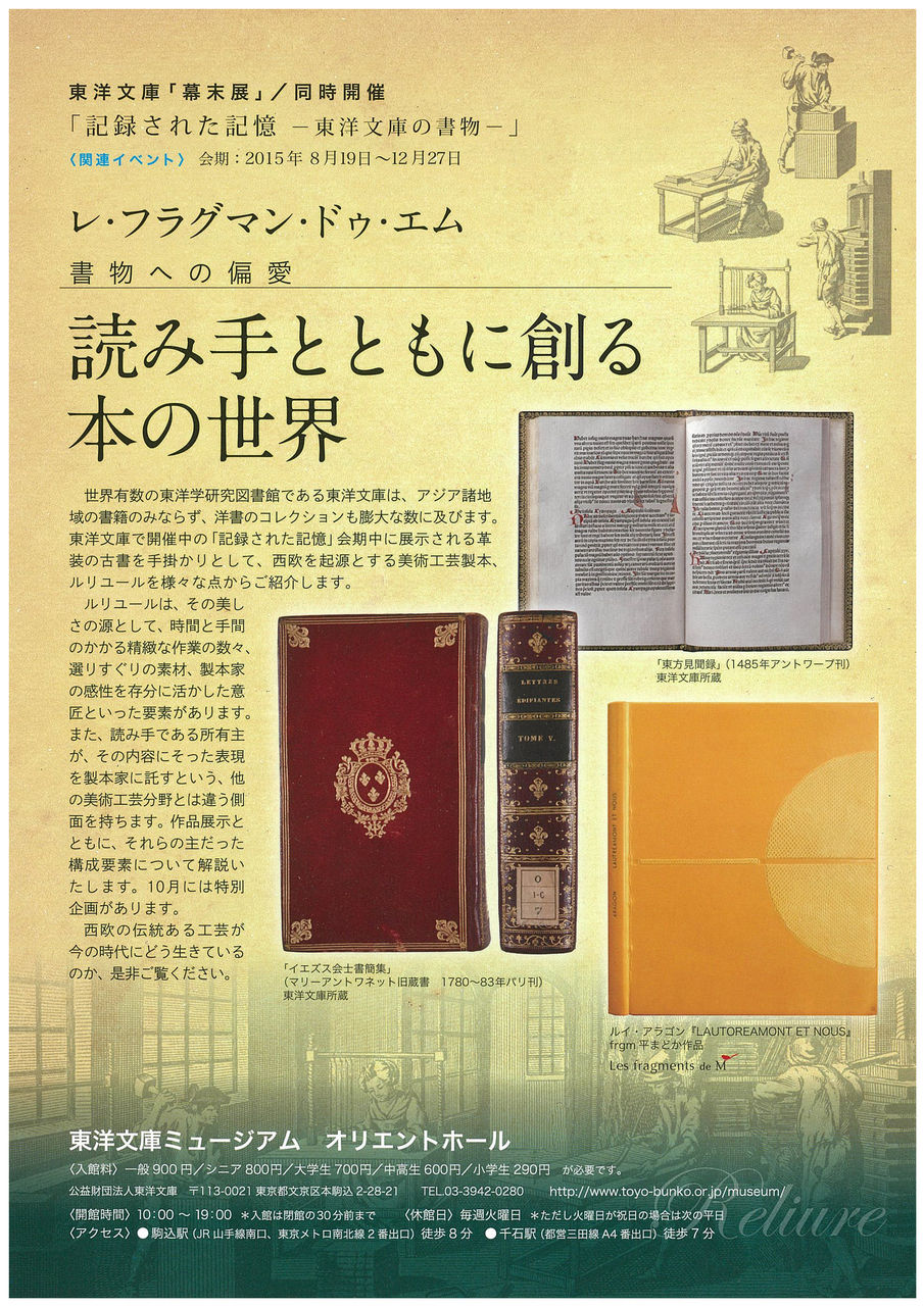 東洋文庫で開催中の「幕末展」並びに同時開催「記録された記憶 ー東洋文庫の書物ー」の会期中、「レ・フラグマン・ドゥ・エム展 書物の偏愛ー読み手とともに創る本の世界ー」が同時開催されます。パネル展示を中心に、ルリユールのイロハをみなさまに知っていただこうと、素材として使用する革やマーブル紙等を説明しています。