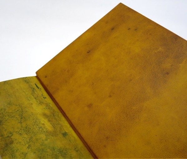 見返しきき紙(表紙の内側にあたる部分)に革を貼る装幀方法。