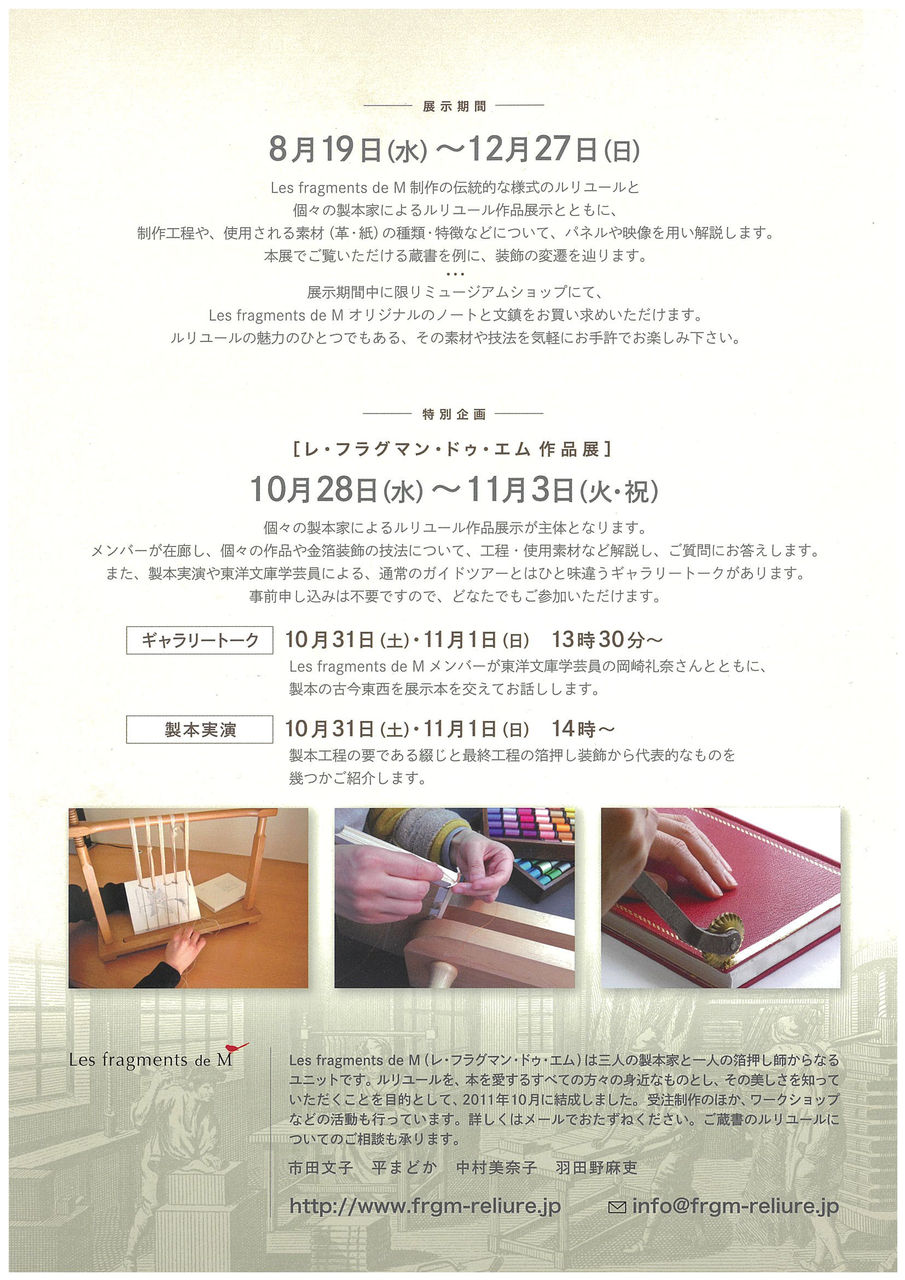 また、特別イベントとして10月28日から11月3日の間、フラグムメンバーが在館し、実演や東洋文庫の学芸員の方との本をめぐるトークを企画しております。みなさま是非足をお運びくださいませ。
