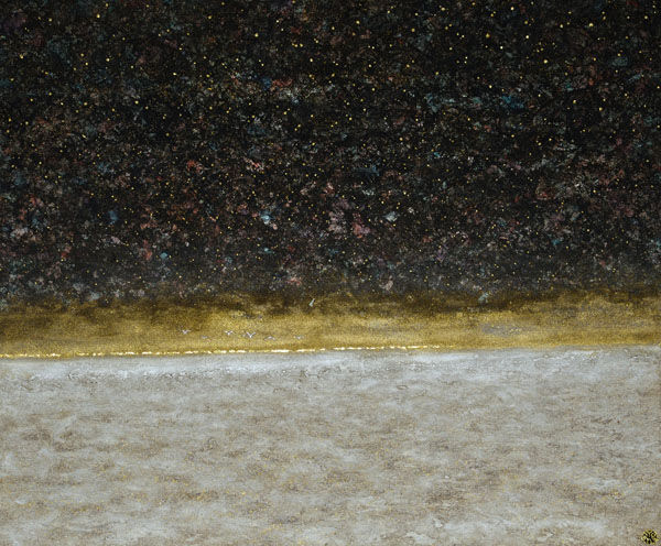 箔画(木パネル、漆、土、金・銀箔、石炭、樹脂、透明アクリル絵具)
