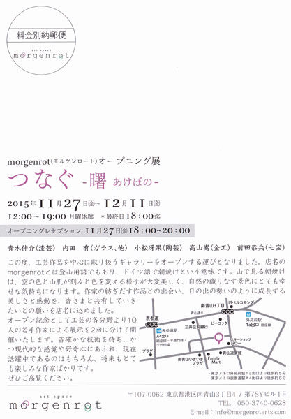 <この度、南青山外苑前に工芸作品を中心に扱うアートギャラリー「morgenrot」(モルゲンロート)を11月27日(金)にオープンいたします。