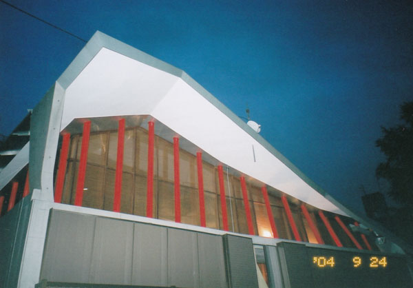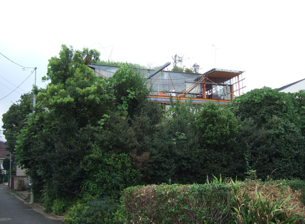 建築家・石山修武の自邸兼設計事務所。4本の柱で支えられた半月状の大梁から床を吊るという構造になっています。