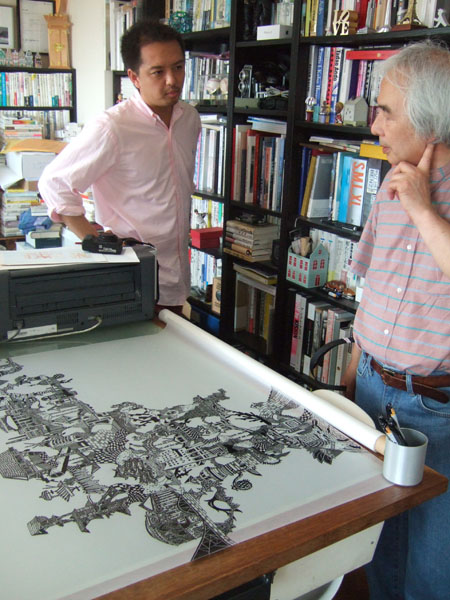 シルクスクリーン制作の打合せ光嶋裕介さんと刷り師の石田了一さん(右)