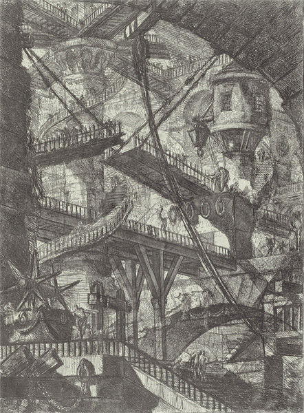 考古学者でかつ旧約聖書の尋常ならざる崇拝者でもあったアタナシウス・キルヒャーや、著名なエッチング集『歴史建築の計画』を描いたフィッシャー・フォン・エルラフッハ、幻想画集や舞台デザインで知られるユヴァーラやビビエーナといった先達者たちに比べ、ピラネージのドローイングに顕著なのは、一見して、その画面自体がもつ説得力がすこぶる強いということだろう。建設科学の知識にもとづくディテールや考古学的に考証された(ように見える)建築言語の配列、それらが架空のコンポジションの中で迫真の演技を見せる。