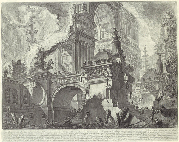 この虚構をより有効なものにするために、ピラネージは過去のさまざまな建築をばらばらにして再構築する。それは建築を構成する慣習に与えた破壊であり、ドローイングの中においてのみそれは可能だった。なぜなら彼の構想はきわめて都市的なシチュエーションの上で展開されたためである。そして彼の描く建築断片の混淆性は、この時代の建築の様式を支える規範の曖昧さと表裏をなす現象でもあった。それは建築の言語体系を司る絶対者の死の光景をも演出したともいえるドローイングであったのだが、にもかかわらず実は表層を彩る建築の壮麗さをもって、新たな歴史のパースペクティヴによって明らかにされた絶対者の不在を隠蔽する試みにほかならなかったと思われる。