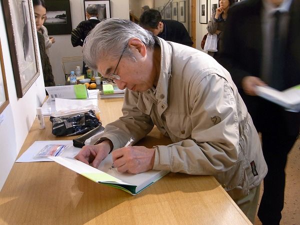 新著『集合住宅30講』にサインする植田実さん。