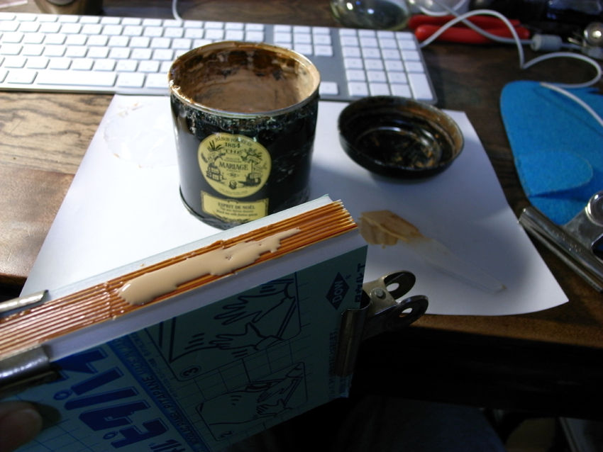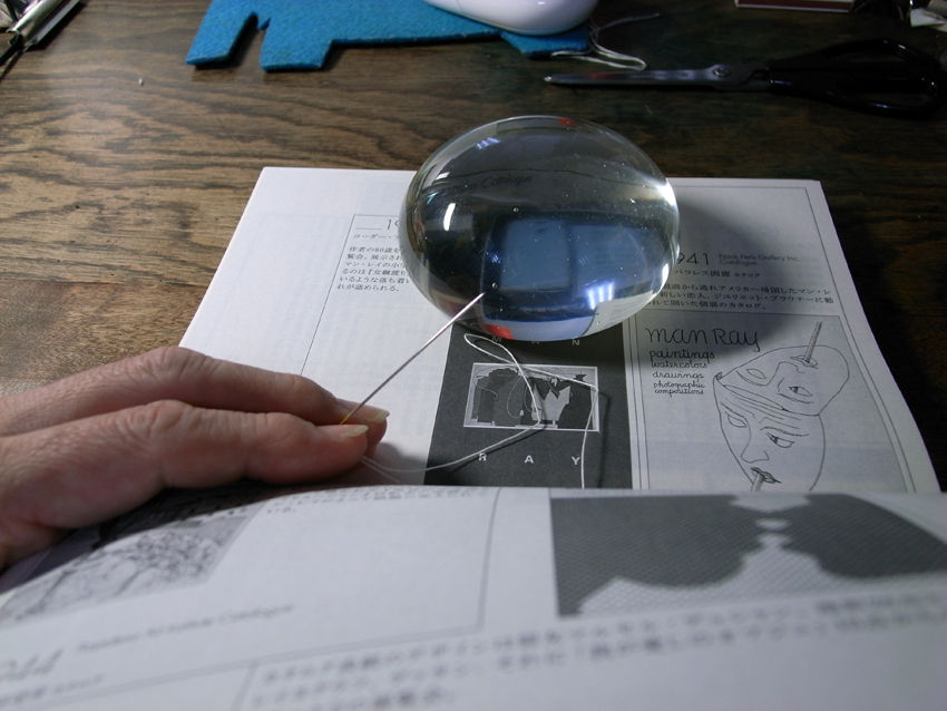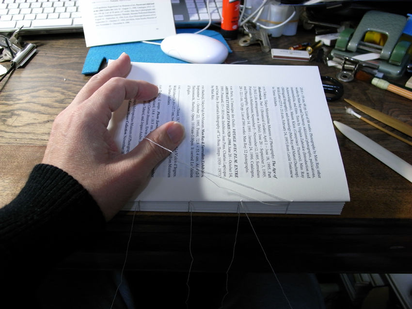 製本作業の工程は、縮小した案内状複製2種と資生堂での展覧会で配付したリーフレット2枚、探求書リストの別紙を差し込んで折帖は8、各冊毎にカッターナイフで切り落とし前小口を揃える事から開始。8丁を合わせるとなると、0.5ミリ単位のズレでも品質を落とすので苦労。刃を常に新しくして対応した。続いてのパピヨン縢りは、糸鋸と千枚通しで位置を決めるも、針先が別の糸をひろって難儀するが、お針子になっているようで楽しい事柄だった。そして、工程で最も気をつけなければならないのは、背固めの方法だった。わたしの場合は、在パリのチサト(連載第20回参照)さんからレミの製本用糊を別けてもらい使用。4回塗ると丁度良い弾力となるのだが、部屋の換気には注意が必要である。これらの作業については、写真を掲載するので参考にしていただきたい。