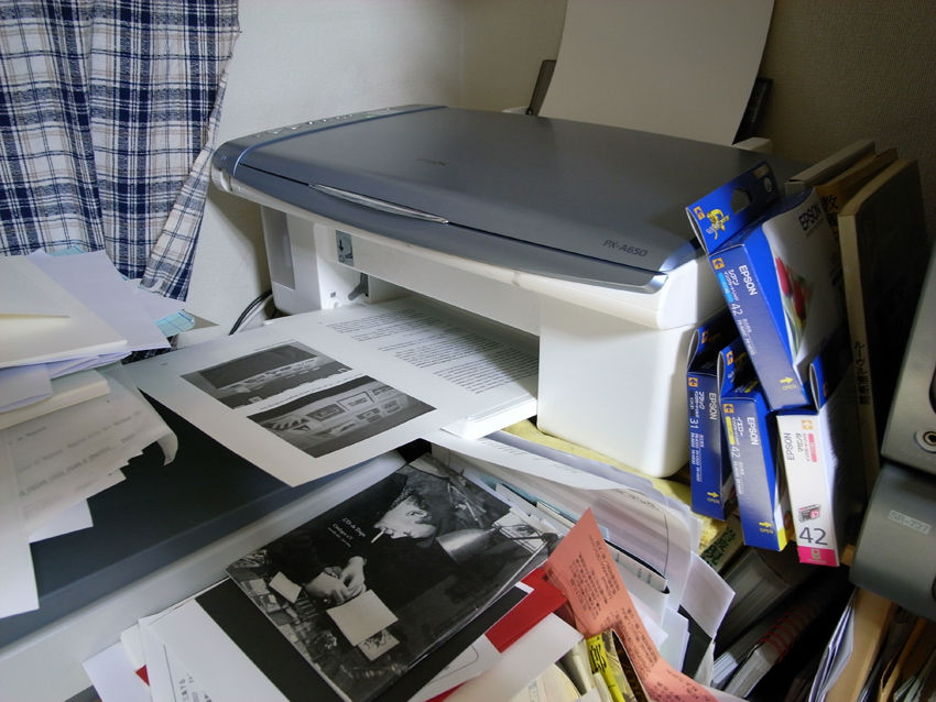 こうして内容を整えた後は、ソフトを使っての具体的なレイアウト作業となる。活字を組む訳ではないので簡単だと思われるかも知れないが、一切合切を自分でやらないと気の済まない性格、廉価で仕上げなければならない制約もあった。家庭用プリンターのエプソンPX-A650は、顔料インク使用なので、書籍印刷に適していると思うが、印刷効果と手触りの良い用紙を選ぶのが最初の関門だった。用紙はA4二つ折の横目(通常は縦目)、この為、別途発註、裁断が伴うのだった。幸い勤務先の関係で用紙問屋との付き合いがあり、サンプル用紙も提供してもらい試行錯誤(画像印字など、紙とインクの相性があるのです)、最終的に平和紙業のエコラシャきぬ70Kgを採用した。両面印刷をすると用紙のくわえもあり微妙に表裏がずれるので、インデザインで調整(1-2ミリの誤差は機械の個体差でもある)、一冊、208頁となったのでインクパックも大量使用、エプソンの機械は給紙機構が弱いので苦労。75部製作としたので、単純計算でA4印刷15,600回、時間が恐ろしくかかった。