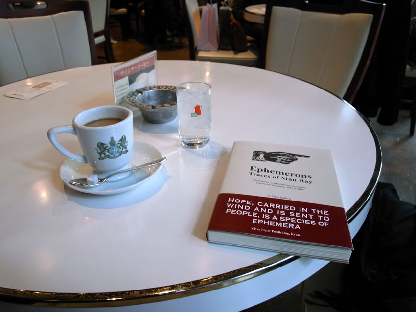 古くからの友人であるデザイナーの高橋善丸氏が、同じデザイナーの杉崎真之助氏と組んでドイツ・ハンブルグ美術工芸博物館で開催した展覧会「真 善 美」の報告をかねた展覧会カタログ(作品集)の出版記念パーティー(2008年2月15日)へ参加した折、翻訳家のディビット・アレン氏を紹介してもらった。アメリカ生まれのイギリス育ち、話をするとマン・レイにも関心をお持ちで、「エフェメラ」本への協力もその場で快諾いただいた。嬉しい出会いである。テキスト5,000字の英訳をお願いしたのは7月、『マン・レイ展のエフェメラ』とする邦題を、どう置き換えるかディビットの意見をお聞した。氏はわたしの行為を、マン・レイの生涯を追跡するものと捉え、読者には「エフェメラ」そのもののインパクトを与え、副題で説明する戦略を導き出した。題して『Ephemerons: Traces of Man Ray』。三条堺町下ルのイノダコーヒ本店で、情緒にとらわれすぎる筆者の「マン・レイ狂い」が、論理的な氏の考えで修正されるのを、感激しながら受け入れた。書体をCourierからTimes New Romanに変更したのも氏の助言によるものだった。