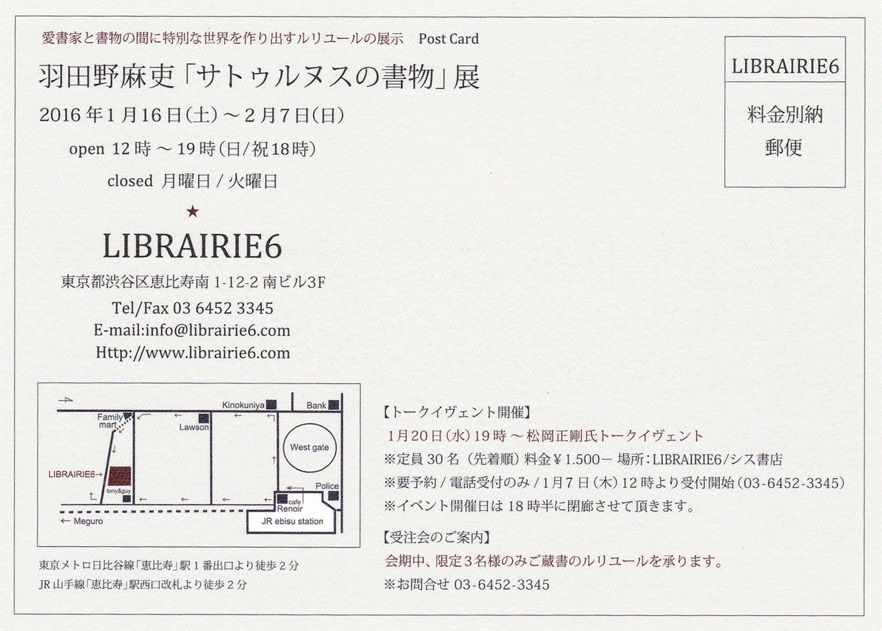 ときの忘れものブログで「ルリユール 書物への偏愛」を連載中のfrgmメンバー、羽田野麻吏さんが恵比寿のLIBRAIRIE6で個展を開催します。