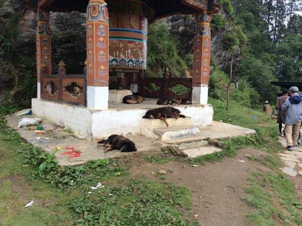 ブータンを旅するとダルシンという縦型の経文旗やルンタという五色の旗が至るところで眼にする。これらの旗は風にはためくたびに書いてあるお経や平和への祈りなどが捧げられるという。まさに「祈り」が山々に、そして水田や川のある風景に満ちている。ブータンではチベット仏教が国教で、学校や施設の朝礼では必ず祈りの言葉を捧げられていたし、子供の僧侶もたくさん見かけた。また、標高3000メートルの絶壁の岩肌に沿うように建立されているタクツアン僧院を訪れた時にも、麓の駐車場から3時間近くかかるにも関わらず、正装で寺院に入り、お供え物を用意し、祈る姿を見ることができた。輪廻転生を信じ、生きているうちに徳を積む(お寺に通い、祈りを捧げ、マニ車を回す)ことで来世が良くなるという。この気持ちがブータンの高い幸福度と関係あるようだ。また、農家を訪れた際、二階の一番良い場所に大きな仏間があり、仏教が生活の中で大きな位置を占めていることを実感した。そして、殺生をきらい、生き物を大切にする姿も至る所にみられた。一番驚いたのは街中や寺院に野犬がたくさんおり、それも日中は安心しきったようにたむろして堂々と寝そべっている。それを誰も追い払おうとしない。えさはどうしているのだろうか。野犬は夜に活動するようで、夜中になると犬の吠える声がきこえる。寝そべる野犬や猫、それにのんびりと草を食んでいる牛や馬はブータンの思い出深い風景だ。農家では牛を飼っているが、あくまで牛乳目的で、自らとさつはしないとのことだ。また、絹織物につかう蚕(かいこ)も、日本では繭(まゆ)のままさなぎを殺して利用しているが、ブータンでは成虫(蛾)が出てきた繭を使っている。そのため紬(つむぎ)の絹織物が中心となってしまうようだ。これらすべてが、ブータン国民のやさしさ、気遣いの深さとつながっているのだろう。