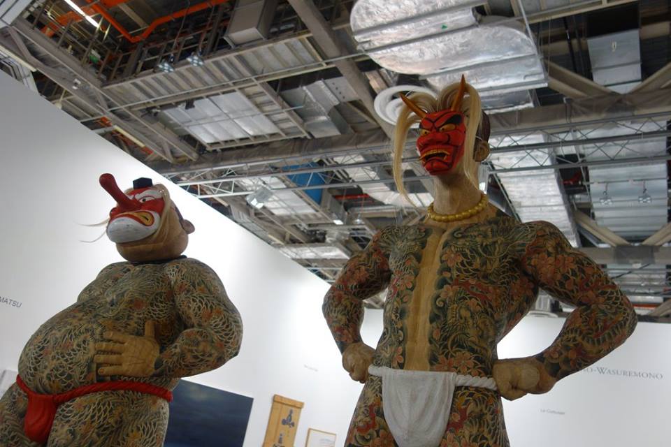 葉栗剛の大作は面白いけど、サイズが大きすぎて…という声は2014年のシンガポールアートフェアの時も聞いていましたので、今回は〈男気〉(天狗)、〈男気〉(般若)と《龍虎次郎》の小サイズ作品も持参。最初は展示の予定はなかったのですが、話を向けると見たいという方が多かったので、収納していた木箱を台座に展示。一昨年のシンガポールアートフェアで大作をご購入された方がいらっしゃり、三点の作品を一目見るなり「買います」と即決。めでたく今フェアの売り上げ第一号となりました。