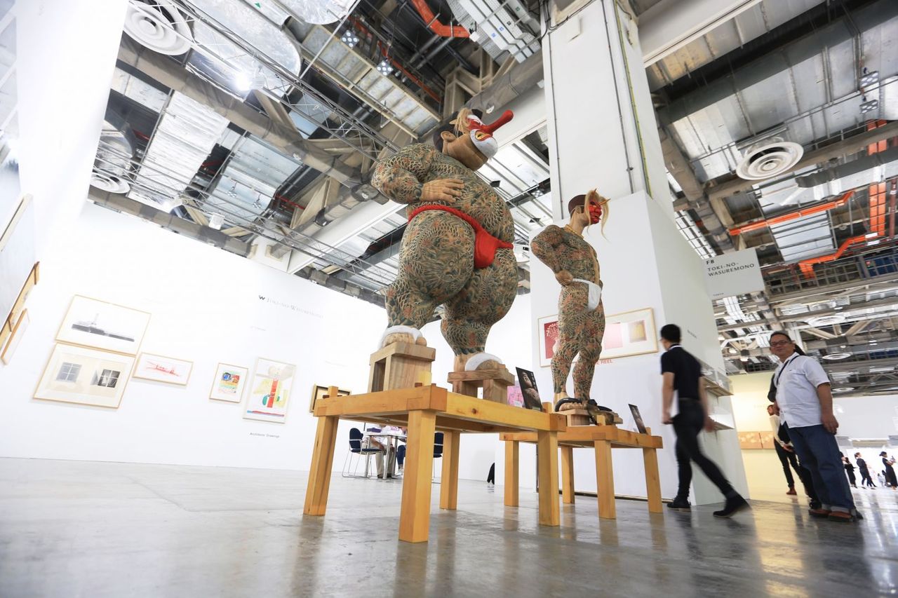ブース全景。葉栗剛の大作シリーズ〈男気〉は、当初はブースの中ほどに設置していましたが、作家の葉栗さんの意見もあってブースの入口に持ってくることに。通路を歩いていると、必ず天狗の鼻先と出っ張った腹が見えるように。