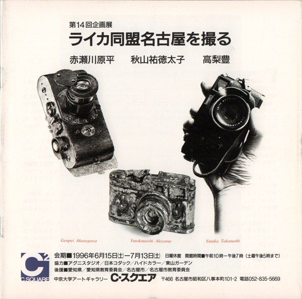 第14回企画「ライカ同盟名古屋を撮る」展は6月15日に幕をあけた。展示は2会場に分け、第1会場には名古屋を撮った新作を、第2会場には銘々が用意した作品をならべた(赤瀬川さんは「猫」シリーズ12点、秋山さんは概ね身辺をモチーフとした写真、高梨さんは人物写真)。初日には南伸坊さんをゲストに迎え、トークイベントを開いた。南さんにとって、赤瀬川さんは美学校時代の恩師、秋山さんは高校の大先輩、高梨さんは「最もよく撮ってくれた」カメラマンである(南伸坊「ライカ同盟へ」『ライカ同盟名古屋を撮る』展パンフレット)。会場には美術家の谷川晃一さんも姿を見せ、3人を喜ばせた。