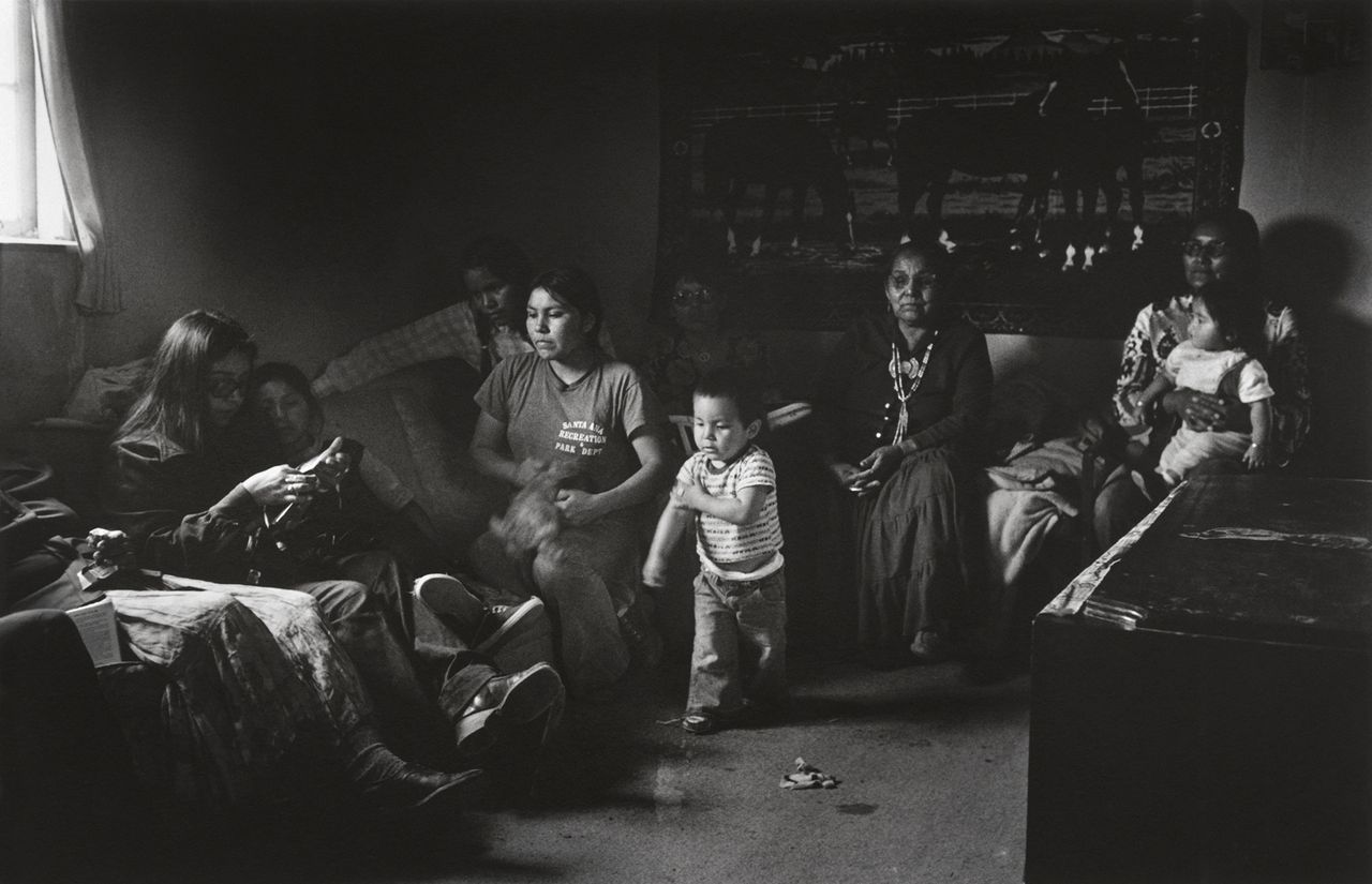 女性の体には幼い息子とおなじくらい光が当たっているし、写真の中央にいるという位置からしても、気を引く存在である。でも、彼女の意識がいまどこに向けられているかは不明だ。サングラスの女性のほうか、動き回る膝の上の生き物か、それともこの部屋とは無関係などこか別の場所をさまよっているのか。