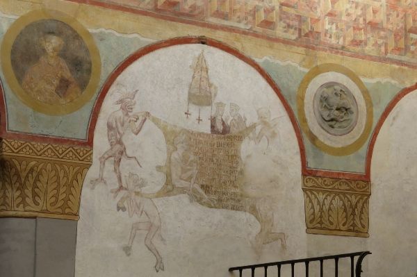 オットー1世の元で権力を享受した修道院で豪華写本が作られた中で、指導的立場だったといわれるライヒェナウは、駅があまりに小さく、駅舎どころかホームらしき舗装部も目に入らず、なんと一駅乗り過ごすという大失敗。タクシー・バス・貸自転車も見当たらない中、何処かの施設の専用だったらしきバスに乗せて頂きました。運転手さんも鬼気迫る顔に負けたようです。修復保存されたオットー1世時代に描かれた壁画が日暮れの近い青空の中、穏やかに迎えてくれました。