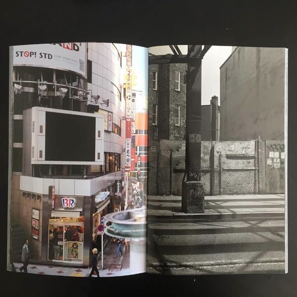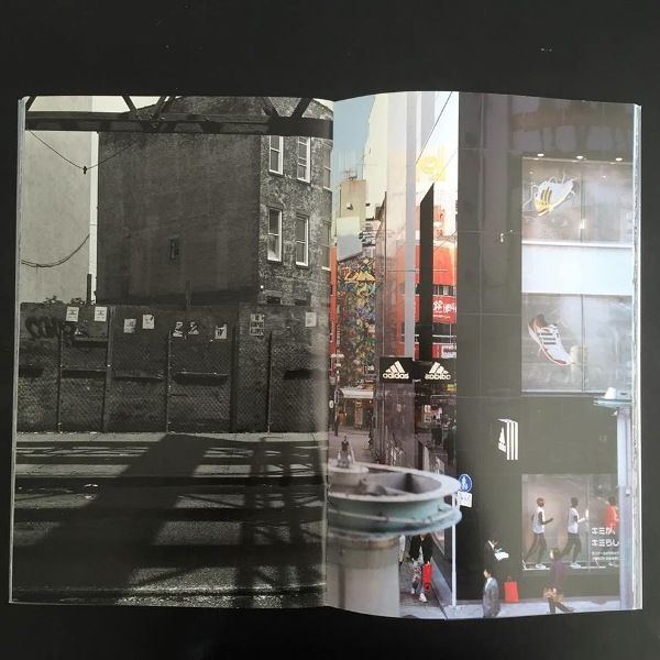 本の真ん中には薄い紙に印刷された奥付のページが表れ、そのページを閉じて上に持ち上げてみるとニューヨークで撮影された白黒写真が見開きに現れます。この見開きを見ることで、この本のデザイン、仕掛けの全容を理解することができます。つまり、一枚の紙の一面に東京で撮影したカラー写真を、もう一面にニューヨークで撮影した白黒写真を印刷したものを重ね合わせ、画面を縦半分に折った上でホチキスで留めて製本されており、重ね合わされて対面した東京とニューヨークの写真が、右半分と左半分に分断された状態の見開きを作り出しています。