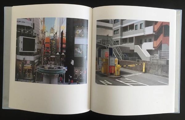 『New York』が白黒写真で緻密な空間の奥行きへと視線を引き込むような効果を作り出しているのに対して、「Tokyo」のシリーズはカラー写真でやや俯瞰するような視点で捉えられたものが多く、写真集ではページの上の方にに写真が配置され、余白の幅は狭く空間の広がりを印象づけるような構成になっています(図10)。『coming back』の見開き(図4)(図5)のように同じサイズで二つの写真を分断・接合するような編集の仕方を経た後に、写真のサイズやページでの位置関係に明確な違いを設定した別個の写真集として提示することで、二つの都市空間の特徴や視点の位置の違いを詳細に吟味するような姿勢をこの二冊の写真集から看て取ることができます。『New York』と『Tokyo』を見た後に再び、『coming back』を見ると、左右に分断された写真と、分断されていない写真の全体像を見比べるなかで、画面の中にそれまで見落としていようなディテール、とくに建造物の素材や構造、建物同士の位置関係といったような、普段生活していても意識に留めないような都市空間の様相が記憶に刻まれていくように感じられます。