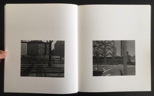 『coming back』に続いて、蒼穹舎から刊行された『New York』と『Tokyo』は、それぞれの都市で撮影した写真をまとめたもので、どちらも同じサイズ、判型、見開きでページに余白を設けてで左右に写真を一点ずつ並べるというオーソドックスな方法で構成、編集されています。『New York』のシリーズを掲載したウェブサイトのページを見ると、一連の写真の多くが、高層建築を見上げたり、あるいは高所から俯瞰したりするような視点ではなく、路上で真っすぐに立って見るような視点で撮影されたものであることや、マンハッタンを遠景に望むような川を隔てたエリアで撮影されたものが多いこと、空間の広がりよりも奥行きを強く意識させるような撮り方をしていることがわかります。ページに余白の幅を広くとって、ページの下の方に写真を配置するという写真集のレイアウト(図9)は、このような視点や写真の撮り方に結びつき、広い余白が穴を覗き込むような効果を作り出し、奥行きの感覚を強めています。