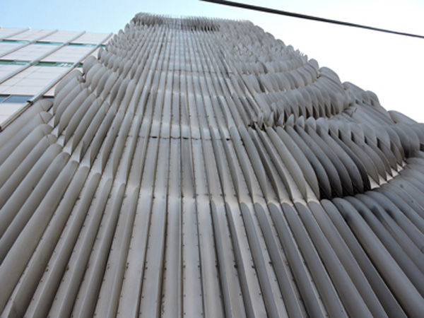 最初の計画では、池田満寿夫美術館が所蔵するブロンズ・レリーフ《手》(一九六七年)がマケットとして提出されたが、最終的には、女の横顔ともハートの重なり合ったような特定しがたい有機的形態、さらには巨大なトム・ウェッセルマンふうのポップ・アート的な唇のイメージ、靉嘔が得意とする平行線のレインボー形態が合成された。弧状の白く光ったアルミ平板を垂直に、平行に並列して構成したオプ・アート的な光の変化の面白さを狙っている。角度を変えて見ると、抽象的なアルミの輝きのなかから具象的な形態が浮き上がってくる。近くで見あげると、どことなくエロティックで、有機的な形態が反復される抽象彫刻にも見えてくる。無機的な四角いコンクリートの近代建築の正面ほぼ半分と側面の一部を占める大胆な曲線に映る光と影のコントラストが、天候と時間の変化に応じて変化し、周囲の景観に強いアクセントをあたえている。