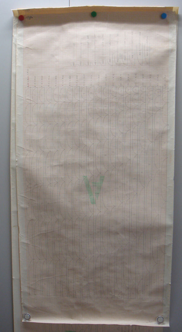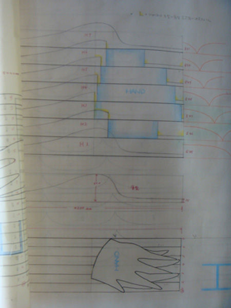 上:手書きの図面。背景のデザインは靉嘔さん、手のデザインが池田さん(最終的に唇に変更)。
