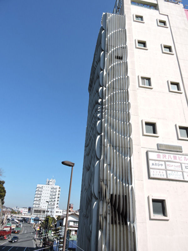 靉嘔との合作によって実現した作品は壁画ではなく、巨大な壁面レリーフだった。神奈川県金沢八景駅近くの七階建の金沢八景ビルの新築時に実現して、現在もそのまま残っている。靉嘔は一九五八年(昭和三十三年)から渡米して不在だったために、日本にいた池田満寿夫がこの壁面レリーフを「担当」した。