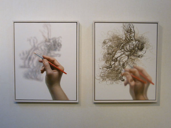 <立体視覚(ステレオスコピック・ビジョン)とは、同時に二つの微妙に違うイメージを見ることである。二つのイメージの差によって、頭の中に立体的な効果が起こる。私の作品は、二つの画面を使いながら左目と右目の距離による視覚的な現象をハイパーリアリズム的、自発的なドローイングとしての表現である。作品中の「手」は、精神への窓としての「目」を象徴している。