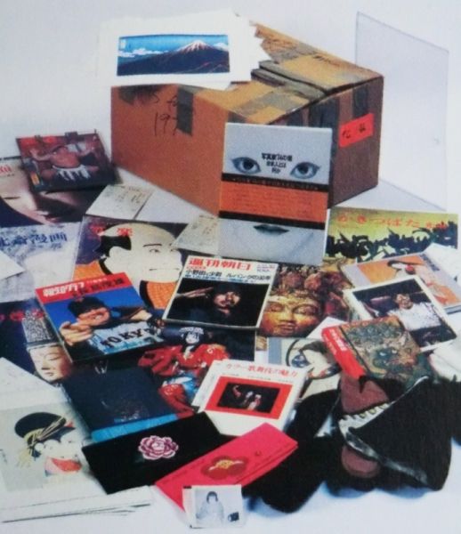 アンディ・ウォーホル「タイムカプセル#102」に見る1974年来日当時に集めたものが中心と思しき日本関連の物品。手前に安斎慶子がウォーホルに贈った手作りの財布が見える。(森美術館 「Andy Warhol」展パンフレットより 2014)