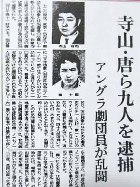 寺山は渋谷・並木橋に第一次・天井桟敷館を出した。1969年12月、ここで状況劇場と花輪をめぐり乱闘事件を起こした。この時の各社新聞記事をすべて封入した封筒に寺山は「『路頭劇 葬式の花輪』 主演・寺山修司、唐十郎、劇団天井桟敷、劇団状況劇場、渋谷警察署」と書いている。ちょっとタイムカプセルを思わせる。