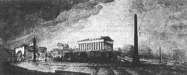 たとえば、以後シンケルやクレンツェをはじめとするドイツ新古典主義者がそのデザインの範典とした不世出の天才F・ジリーによる「フリードリッヒ大王のためのモニュメント」(一七九七年、なおシンケルによるコピードローイングを見よ)をみれば、そのセレブレートされるものがほかならぬ国家君主そのものであり、その意図を先鋭化するために古代の建築様式や作法がこの公共モニュメントの中で変形・再構築されているのがわかるだろう。様式は目的を逐行するために操作される。そしてこの動向はナポレオン戦争以後ますます加速化され、ついにはナショナリズムと連帯した国民様式の再生(様式の擬造というべきか?)へと至るのである。