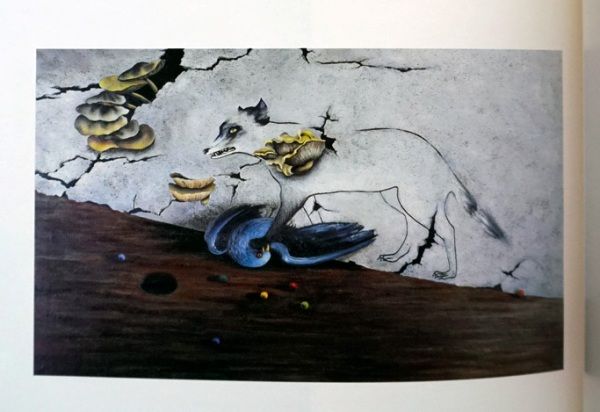 広大な会場には眼もくらむ価格帯の貴重な古書が所狭しと並ぶ。当時、シュルレアリスム関連の文献を熱心に集めていて、古書店のブースの棚をざっと眺めわたすと、めぼしい「獲物」がありそうかどうかはなんとなくわかるものだ。書棚を物色しながら、会場の中央よりややはずれたあたりのガラスケースでぴたりと足が止まった。豹が向かい合った図柄のどこか見覚えのある小さなドローイングが飾られている。チェコの女性シュルレアリスト・トワイヤンの『塔のなかの井戸-夢の断片』(RADOVAN IVSIC『LE PUITS DANS LA TOUR』-TOYEN『DÉBRIS DE RÊVES』 1967)の中にある図版の一部とそっくりだ。