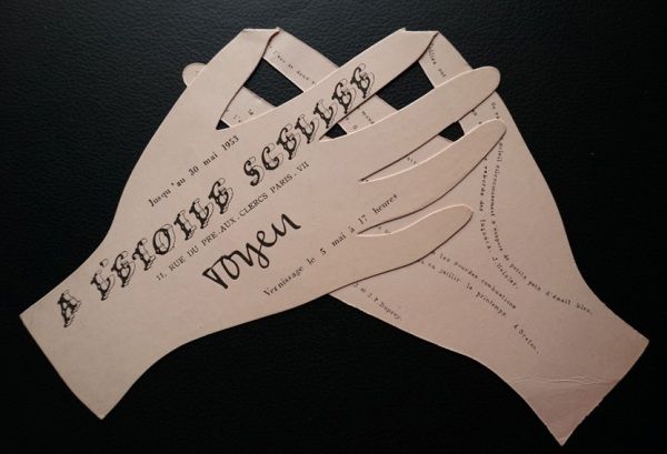 toyen5パリのギャラリー l'Étoile Scellée(『封印された星』画廊)での「手」の形をしたトワイヤン展招待状(Galerie l'Étoile Scellée 1953 )。プラハの古書店で入手。