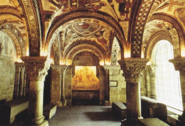 帰国後、本で確認したところによれば、6つに区分された天井にそれぞれ主題の異なる図像が展開されている。中心は12世紀の教会堂へと続く中央奥の区画で、4福音書記者(右足下に獅子の顔を持つマルコ、左足下に雄牛の顔を持つルカ、右手上に鷲の顔を持つヨハネ、左手上に人の顔を持つマタイ)を従えた「万物の支配者(パントクラトール)たるキリスト」が、アーモンド型の光輪の中に、左手に聖書(「EGO SUM LUX MUNDI:わたしは世の光である」の文字が見える)を持ち、右手を挙げて世界を祝福している。右奥の天井と壁面には「キリストの降誕」の諸場面が描かれ、右奥の天井には、この王廟壁画の中の最高傑作と言われる「羊飼いたちへのお告げ」、右手前の天井には「ヘロデ大王の幼児殺戮」、壁面には「受胎告知」「マリアのエリサベツ訪問」「降誕」「エジプト逃避」「公現」「宮詣」が描かれている。