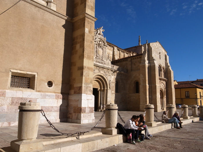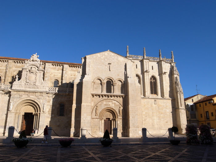 サン・イシドロ教会10世紀の初め、レコンキスタに勝利したアストリアス王国は首都をオビエドからレオンに移してレオン王国となる。国王ラミオ2世は王女のために王宮の隣に女子修道院を創設し、また近くにはコルドバの少年殉教者ペラヨの遺骸が移送され聖堂が建設される。これらは10世紀末にイスラム勢力によって破壊されてしまうが、11世紀の初め、レオンの再建に当たったアルフォンソ5世は、この女子修道院を再興し、仮設の教会を建てて王家の墓所とする。これをフェルナンド1世がロマネスク様式で建て替え、1063年にセビージャの教父イシドロの遺骨を奉遷して「サン・イシドロ教会」として奉献。巡礼の興隆と共に手狭となったため、1101年新会堂が建てられ始め、1149年に献堂される。