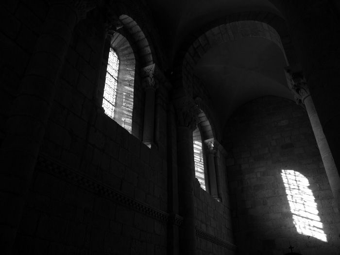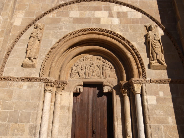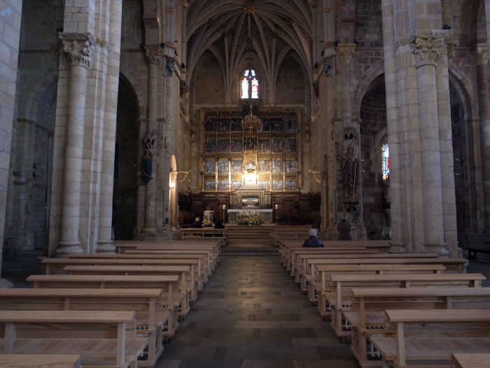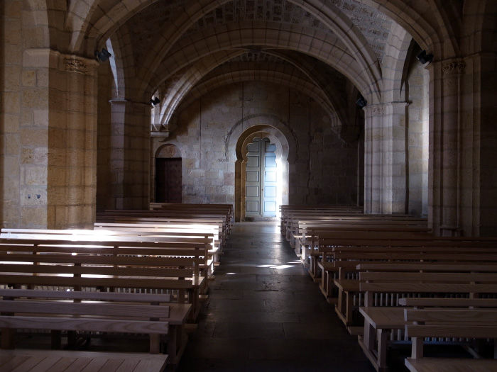 堂内は3廊式のロマネスク様式の空間である。身廊は半円形のアーチを支える角柱の列で仕切られ、石造りのヴォールト天井であるが、身廊の上部と側廊にロマネスク様式としては大きな窓が開いているため、スペインの陽光とも相まって内部は明るい。角柱と壁面には半円形の付け柱があって、浮き彫りを施した柱頭が並ぶ。12世紀前半のロマネスク彫刻最盛期の作品であるが、今の自分には絵画以上に味わうのが難しい。いつか分かるようになりたいとは思っているのだが。