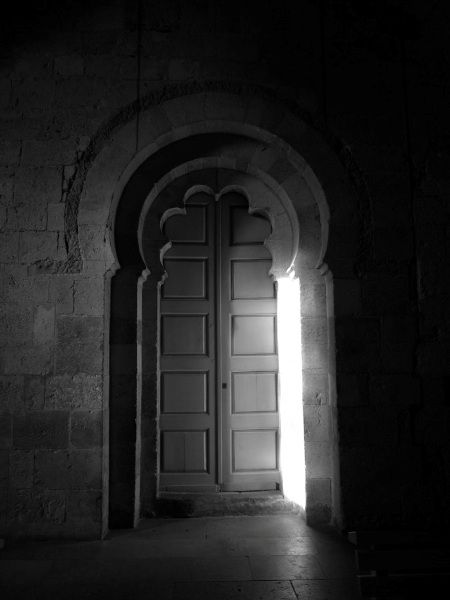 贖罪の門 タンパン彫刻堂内は3廊式のロマネスク様式の空間である。身廊は半円形のアーチを支える角柱の列で仕切られ、石造りのヴォールト天井であるが、身廊の上部と側廊にロマネスク様式としては大きな窓が開いているため、スペインの陽光とも相まって内部は明るい。角柱と壁面には半円形の付け柱があって、浮き彫りを施した柱頭が並ぶ。12世紀前半のロマネスク彫刻最盛期の作品であるが、今の自分には絵画以上に味わうのが難しい。いつか分かるようになりたいとは思っているのだが。