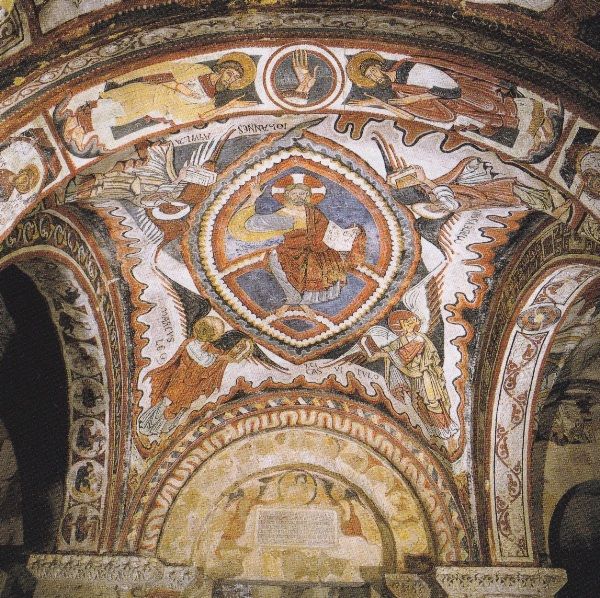 座せる全能の神キリスト像 (c)スペイン政府観光局帰国後、本で確認したところによれば、6つに区分された天井にそれぞれ主題の異なる図像が展開されている。中心は12世紀の教会堂へと続く中央奥の区画で、4福音書記者(右足下に獅子の顔を持つマルコ、左足下に雄牛の顔を持つルカ、右手上に鷲の顔を持つヨハネ、左手上に人の顔を持つマタイ)を従えた「万物の支配者(パントクラトール)たるキリスト」が、アーモンド型の光輪の中に、左手に聖書(「EGO SUM LUX MUNDI:わたしは世の光である」の文字が見える)を持ち、右手を挙げて世界を祝福している。右奥の天井と壁面には「キリストの降誕」の諸場面が描かれ、右奥の天井には、この王廟壁画の中の最高傑作と言われる「羊飼いたちへのお告げ」、右手前の天井には「ヘロデ大王の幼児殺戮」、壁面には「受胎告知」「マリアのエリサベツ訪問」「降誕」「エジプト逃避」「公現」「宮詣」が描かれている。
