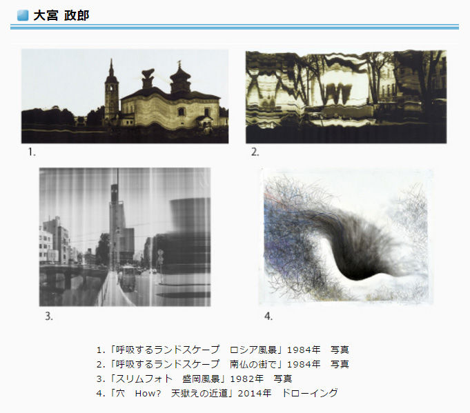 大宮政郎は、1960年代の岩手県における前衛的な芸術活動に始まり、その後は知覚の在り様と変化について、移動的視点による「人動説アート」を展開し、ドローイング、版画、立体、写真と多彩な表現を通じ、実験と思索を繰り返しながら制作を続けました。今回は大宮が1980年代に取り組んだ独特な空間意識を写真表現に反映した「呼吸するランドスケープ」「スリムフォト」シリーズ、および新作のドローイング作品を紹介します。