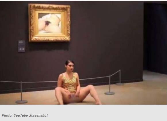 パリ、オルセー美術館のクールベ「世界の起源」のまえで女性器をM字開脚でさらしたルクセンブルクの女性アーティスト、デボラ・ド・ロベルティ。2014年5月。
