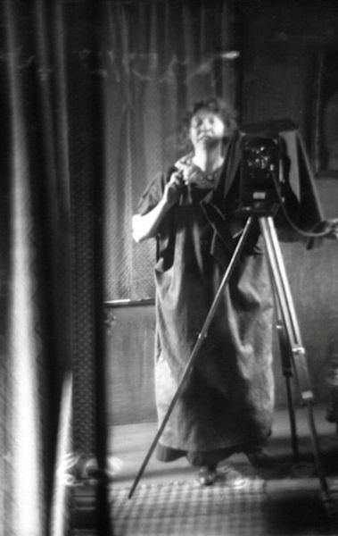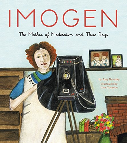 今回取り上げるのは、20世紀のアメリカを代表する写真家の一人であるイモジン・カニンガム(Imogen Cunningham 1883-1976)の伝記絵本『IMOGEN: The Mother of Modernism and Three Sons(イモジン:モダニズムと3人息子の母)』です。作者のエミー・ノヴスキーAmy Novesky)は、主に児童文学の分野で活躍する文筆家で、著名な女性の芸術家を題材にした絵本を発表しており、過去にはフリーダ・カーロやジョージア・オキーフについて、最近ではルイーズ・ブルジョワについての絵本が刊行されています。絵は、イラストレーターのリサ・コンドンが手がけており、明るい色合いと素朴な描写が親しみを感じさせ、三脚に備えつけられたカメラとともに描かれたイモジン・カニンガムの姿が、彼女のセルフポートレート(図2)に似ていることからも明らかなように、カニンガムが撮影した写真を参照して描かれた部分も多く見られます(写真作品との関係はまた後ほど詳述します)。