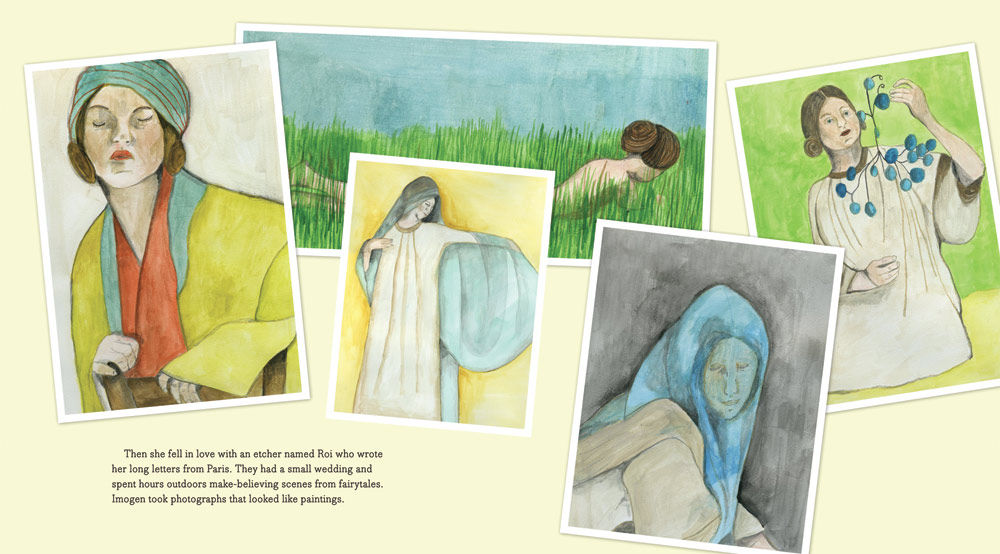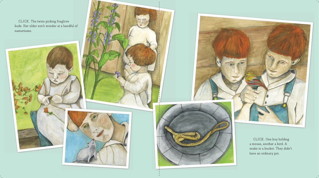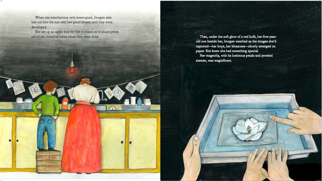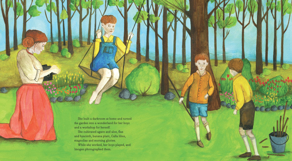 イモジン・カニンガムは、20世紀初頭から70年以上写真家として活動しましたが、この絵本の中では、19世紀末から1920年代前半にかけて、彼女が写真家を志した10代の頃から写真家として活動し、版画家のロイ・パートリッジと出逢って1915年に結婚し(1934年に離婚)、3人の息子(1915年に長男のグリフィッド、1917年に双子のロンダルとパードレク)が生まれて、育児をしながら制作活動に取り組んだ時期のことが描かれています。絵本のタイトルにも示されているように、芸術家としての活動と3人息子の育児をどのように両立させて、作品を作り出していったのかということが、物語の核になっています。作者のノヴスキー自身が、自宅で著述家・編集者として仕事をするワーキングマザーであり、彼女は、女性が仕事や家庭に関して、限られた選択肢しか持ち得なかった20世紀初頭という時代において、イモジン・カニンガムがいかにして人生を切り拓き、仕事と生活を結びつけたのかということを描き出して子どもたちに伝えたかった、とインタビューの中で語っています。絵本の物語は、カニンガムの人生にまつわる史実・資料を参照しつつ、子どもたちにも読みやすいように、簡潔な文体で語られています。また、彼女の人生の軌跡に重ね合わせるようにして、カニンガムの写真作品が色や描写に演出を加えつつも、元の作品に照らし合わせると、ある程度判別できるように描き出されています。