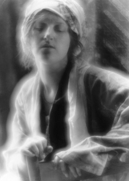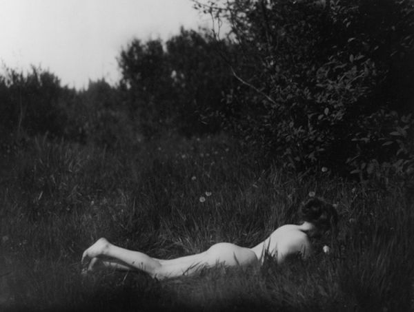 カニンガムは、シアトルで貧しい大家族に育ちながら、10代の頃から写真家になることを志して、家族の中で唯一大学に通って化学を学び、さらに奨学金を得てドイツに留学、帰国後の1910年にはシアトルに戻ってわずかな資金を元に肖像写真館を開設します。19世紀末から20世紀初頭にかけてピクトリアリズム(絵画主義写真)運動が隆盛していた時期に彼女が制作した作品を紹介する見開き(図3)では、「夢」(図4 図3では左端の作品の元になっている)やヌードのセルフポートレート(図5 図3では画面中央の作品の元になっている)のような作品が描き込まれており、写真の歴史的な文脈に関する知識がなくても、人物の表情やポーズから当時の「絵画のような写真」がどのようなものだったか、そのおおよその雰囲気が伝わるようになっています。