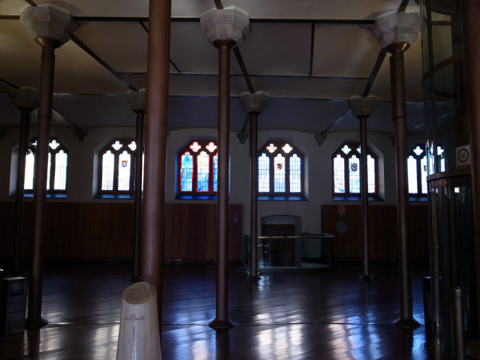 入り口現在は銀行として使われている1階を見てみよう。広くて明るいフラットな空間がそこにはあり、間仕切りが自由なユニバーサル・スペースを目的としているのがわかる。鋳鉄製の円柱独立柱と鉄骨梁で構成されている。それは石に代わる建材として登場した鉄によって可能となった構造合理主義の商業スペースである。土地と空間の有効活用。単位面積当たりの収益の最大化。これがゆくゆくはライトのジョンソン・ワックス本社やミースのシーグラム・ビル、そしてついにはニューヨークのツインタワーにまで行き着くのだろうが、ガウディは「自然に直線はない」と、つるつるぴかぴかのユニバーサルスタイルに背を向けるようにして独自の道を歩むことになる。だからこの経済合理主義に基づく近代建築に片足を突っ込んだ感のあるボティネス邸には、まるでガウディを感じない。何も知らない状況でこの建築を誰が設計したか当ててみろと言われてもガウディとは答えられないだろう。これはガウディがガウディになる前の建築と言える。カサ・ミラやグエル教会、そしてサグラダ・ファミリアとはその向きが大きく異なる。これはガウディが時代の要請に合わせた建築と言えるかもしれない。